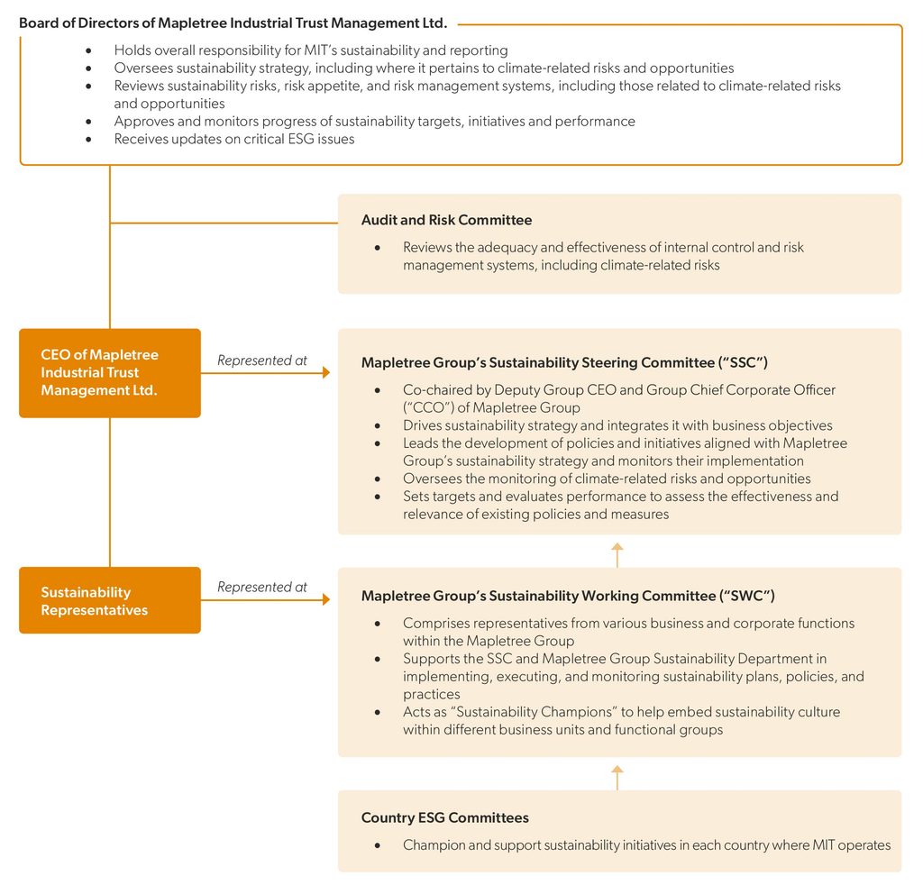 The Board is supported by several committees, which oversee the implementation and operationalisation of the Board’s sustainability plans. These committees comprise a wide range of roles and functions, which allow for effective oversight of MIT’s sustainability performance and progress. MIT’s wider sustainability governance structure includes representatives from both the Manager and the Sponsor, which ensures overall alignment with the Mapletree Group’s sustainability ambitions.